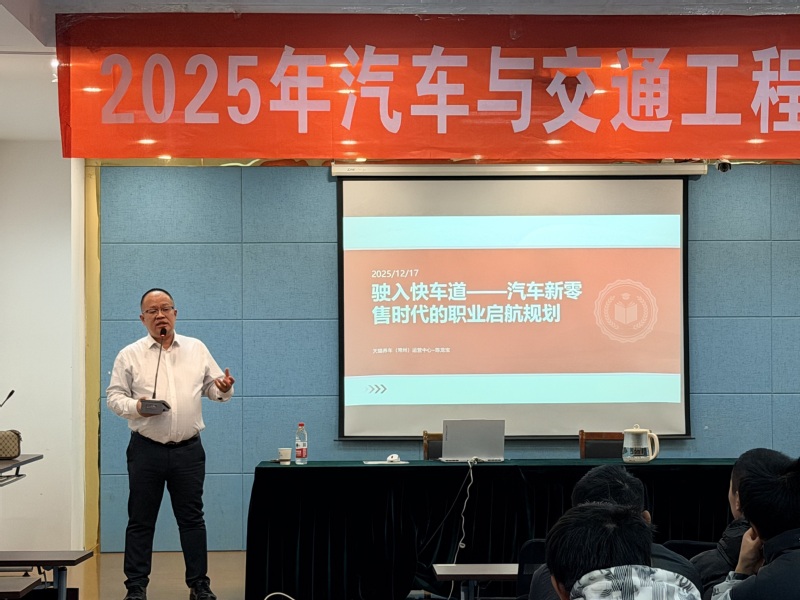 在汽车产业智能化、服务化转型加速的背景下,为帮助学生明晰职业方向、提升就业竞争力,12月17日晚,学院在314报告厅举办职业生涯规划专题讲座。本次讲座特邀天猫养车(常州)运营中心总经理陈龙宝担任主讲嘉宾,带来题为《驶入快车道——汽车零售时代的职业启航规划》的精彩分享。