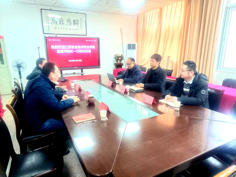 2026年1月28日上午,江苏安全技术职业学院汽车与交通安全学院院长吴德平、组织员王远、工会主席王平一行3人来我院调研交流。我院院长张兰春、副院长倪彰、汽车运用工程系主任王奎洋、支部书记蒋科军接待并参与座谈。